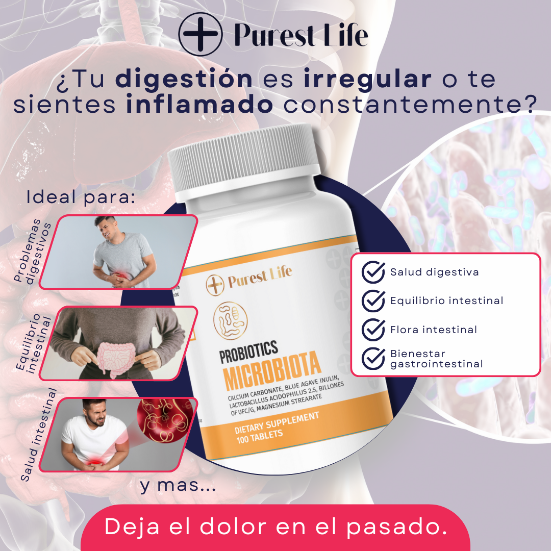 Probióticos Purest Life repuebla la microbiota intestinal, mejora la digestión, la absorción de nutrientes y refuerza el sistema inmune.